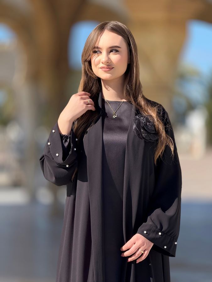 .فدوى عباية أنيقة وراقية. قماشها ناعم وخفيف ينساب على الجسم، ولمساتها المتقنة تزيدها نعومة وعصرية