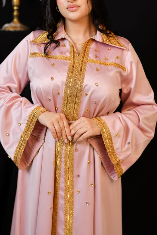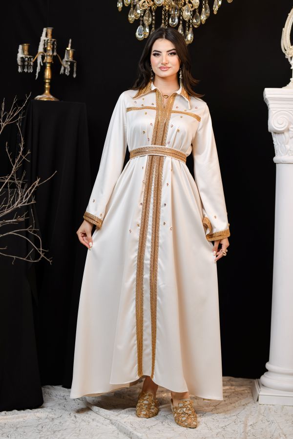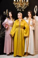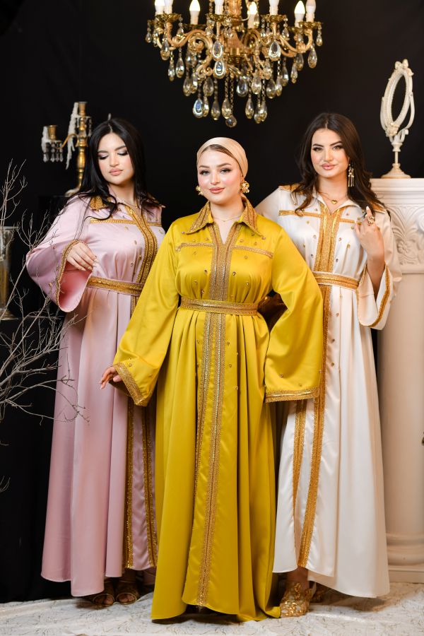Chahinez est un kaftan qui incarne la douceur et la force. Son tissu léger et ses broderies expriment une beauté audacieuse et unique.
