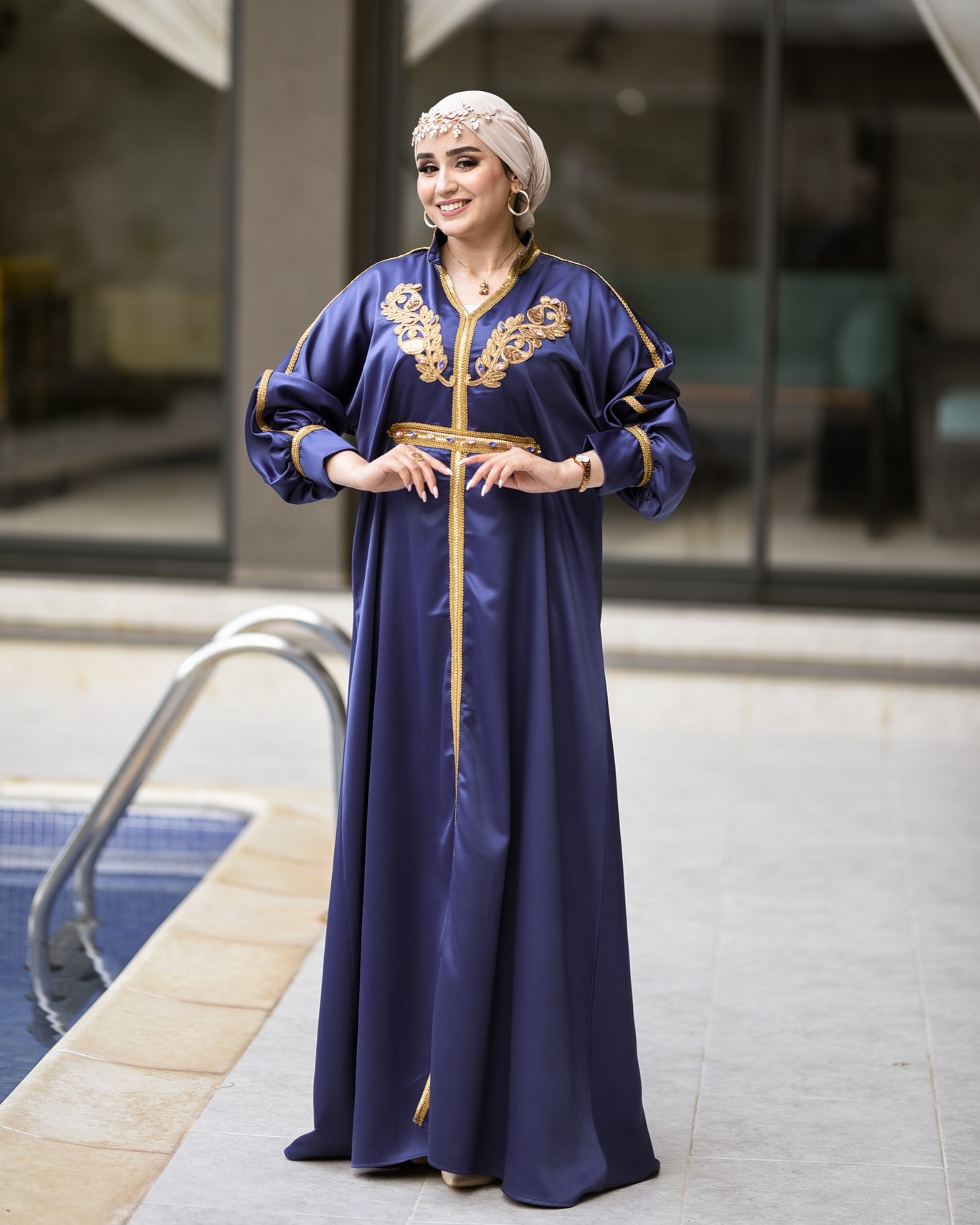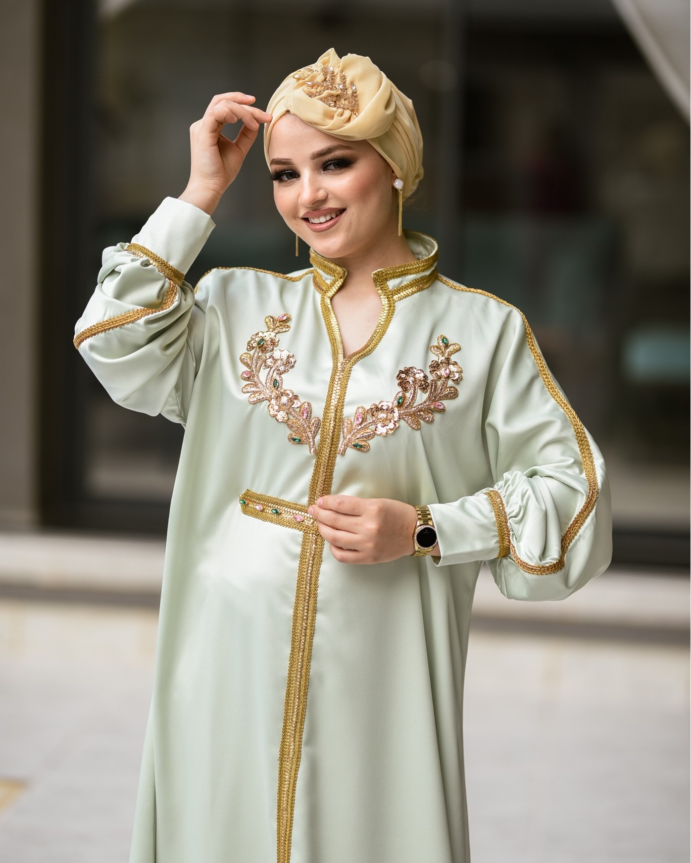 Jouri est un kaftan qui incarne la grâce et la tradition avec une touche contemporaine. Son tissu fluide et ses broderies délicates mettent en valeur une élégance subtile et intemporelle.