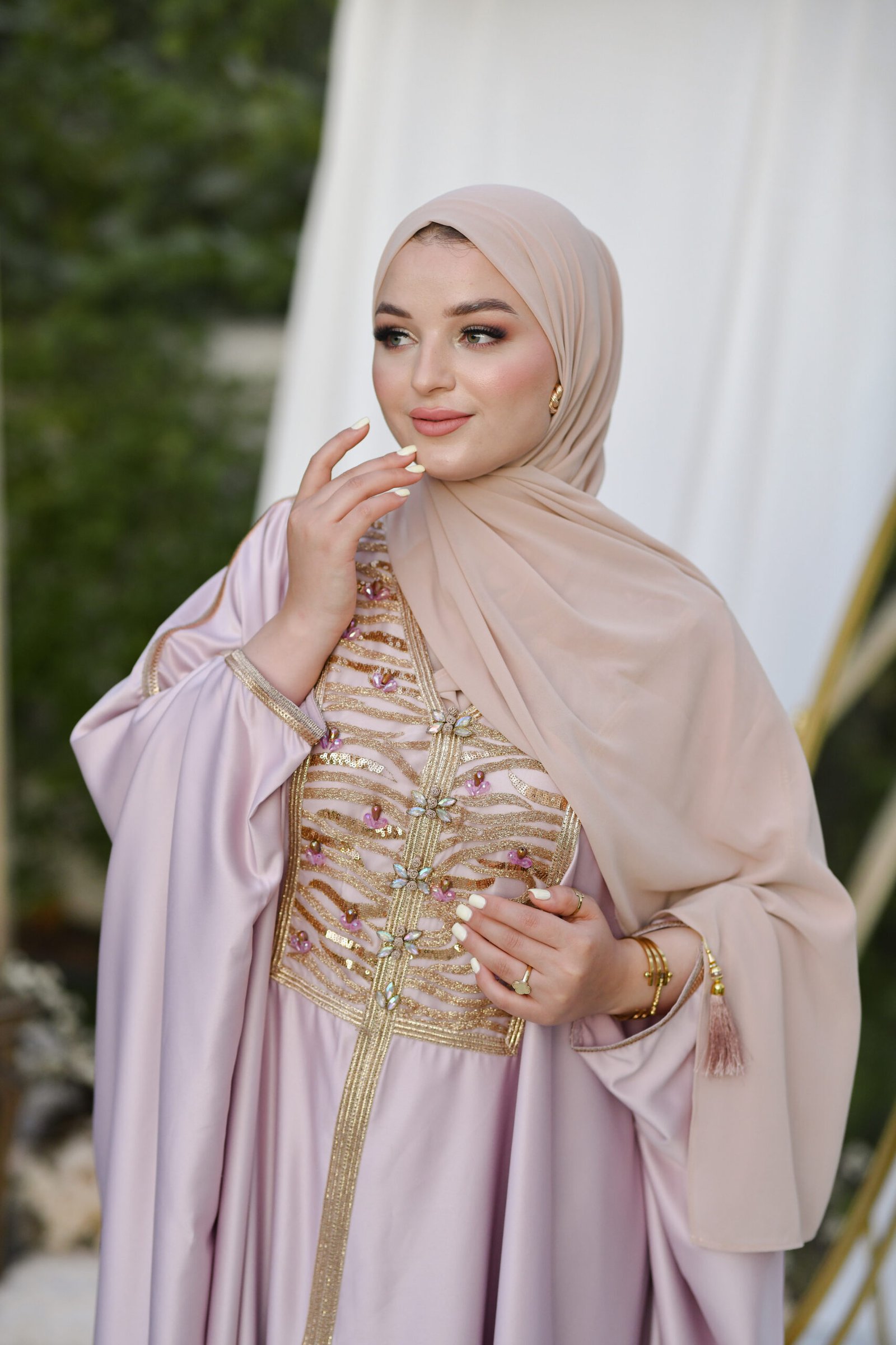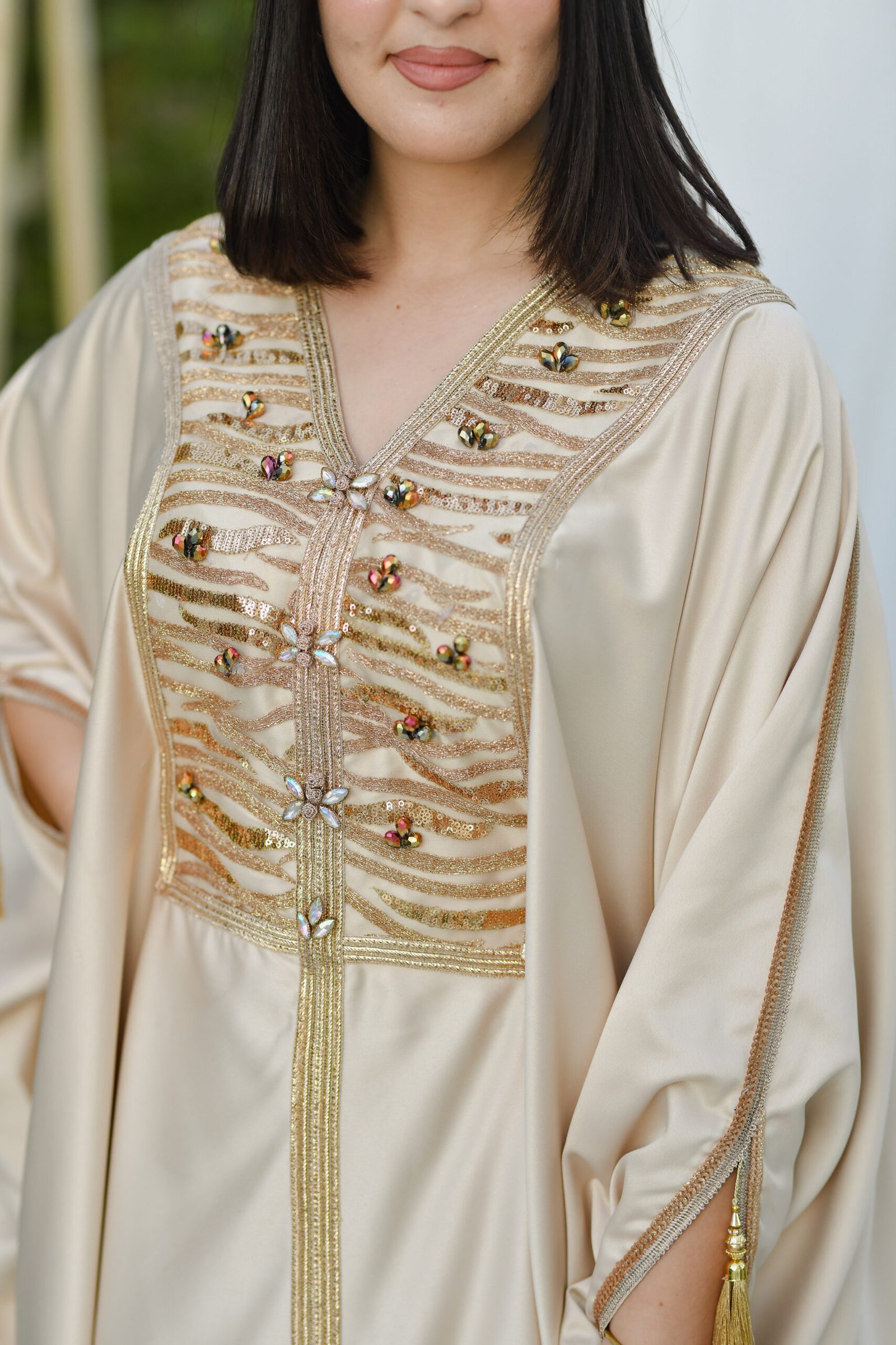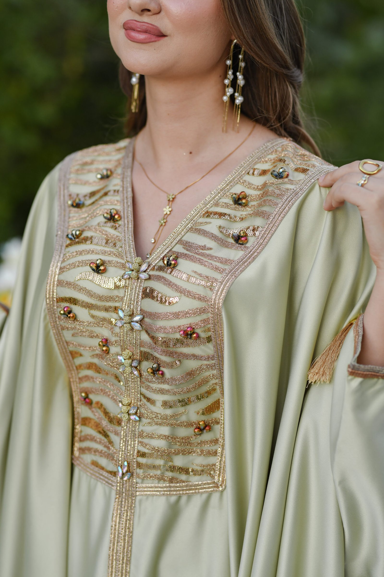 Layan est un koftan qui reflète la splendeur authentique tunisienne. Son tissu léger et fluide, associé à ses broderies traditionnelles, lui confère un éclat particulier, révélant l’élégance et la dignité de celle qui le porte.