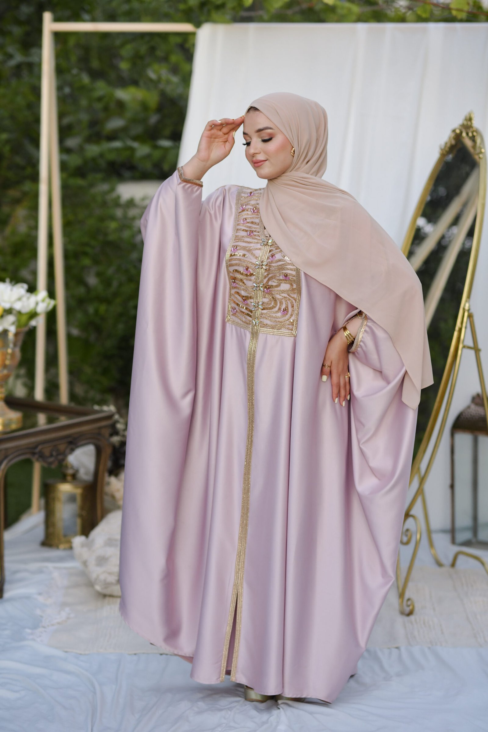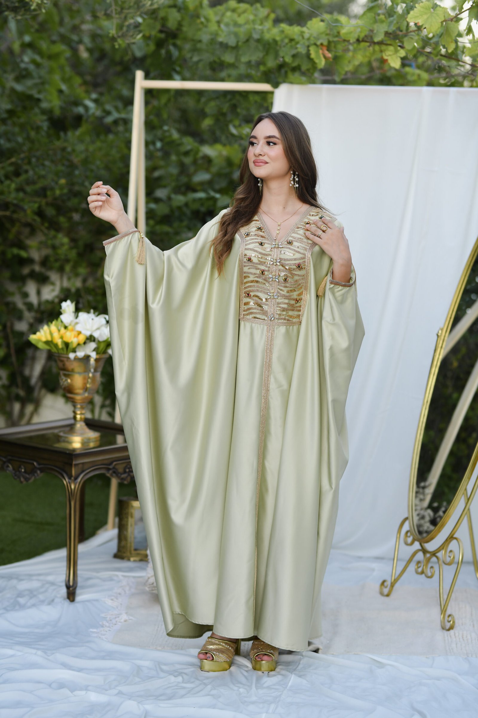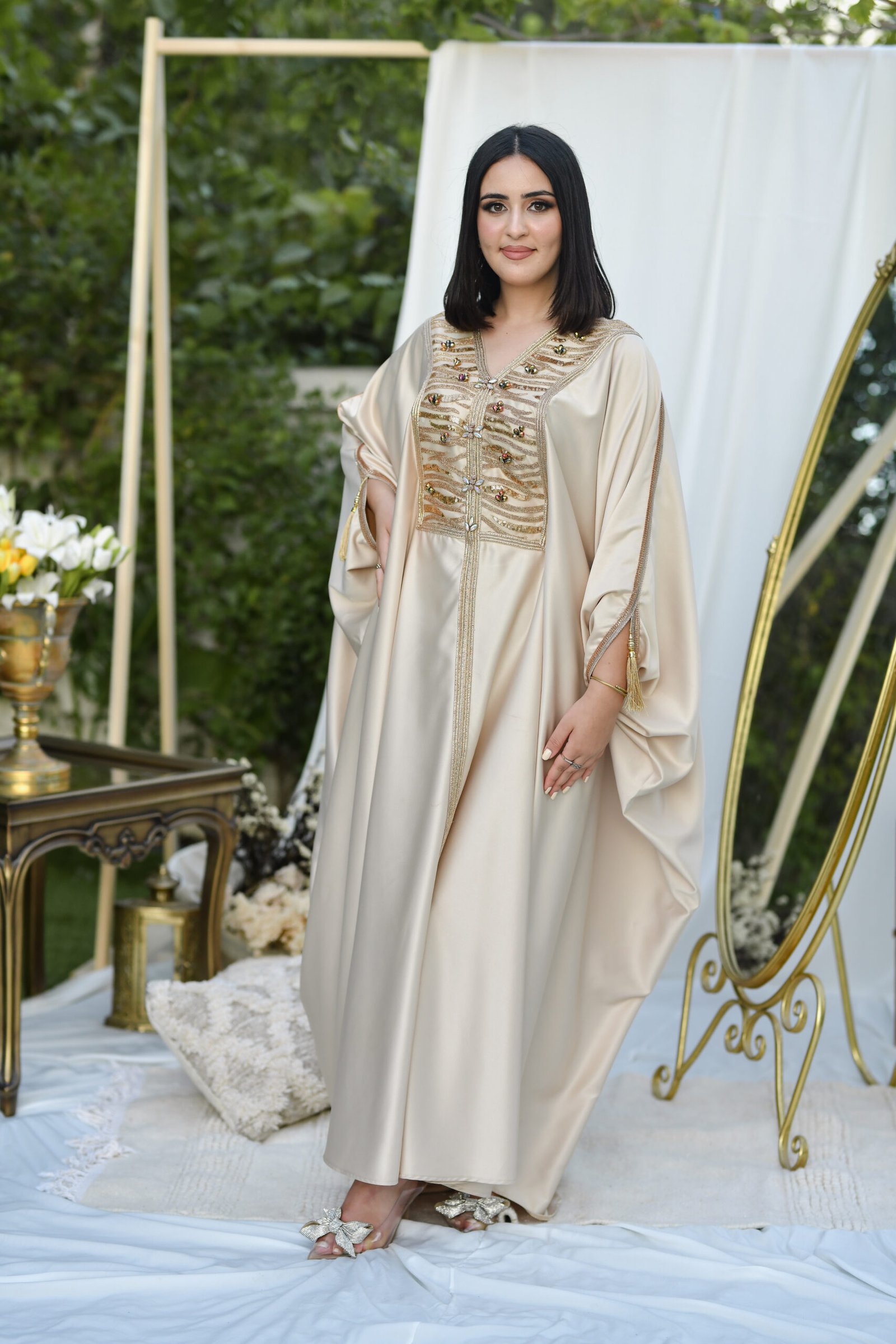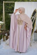 Layan est un koftan qui reflète la splendeur authentique tunisienne. Son tissu léger et fluide, associé à ses broderies traditionnelles, lui confère un éclat particulier, révélant l’élégance et la dignité de celle qui le porte.