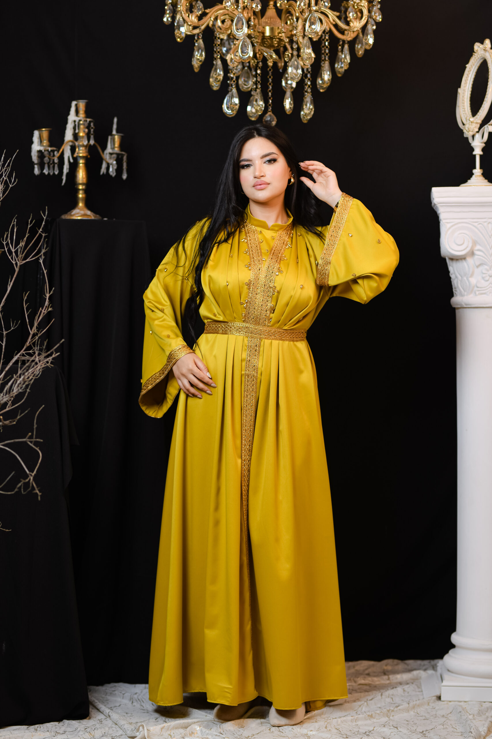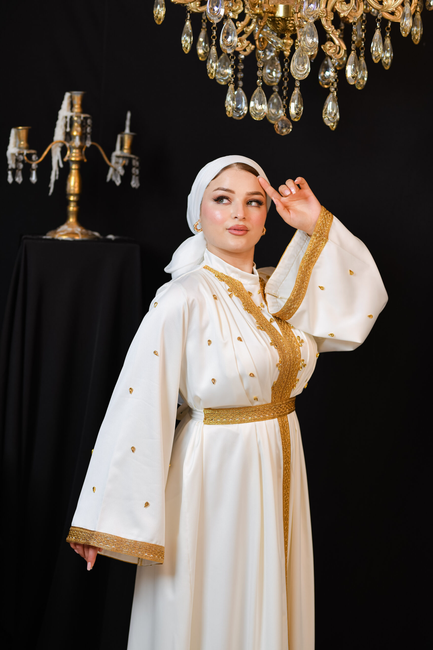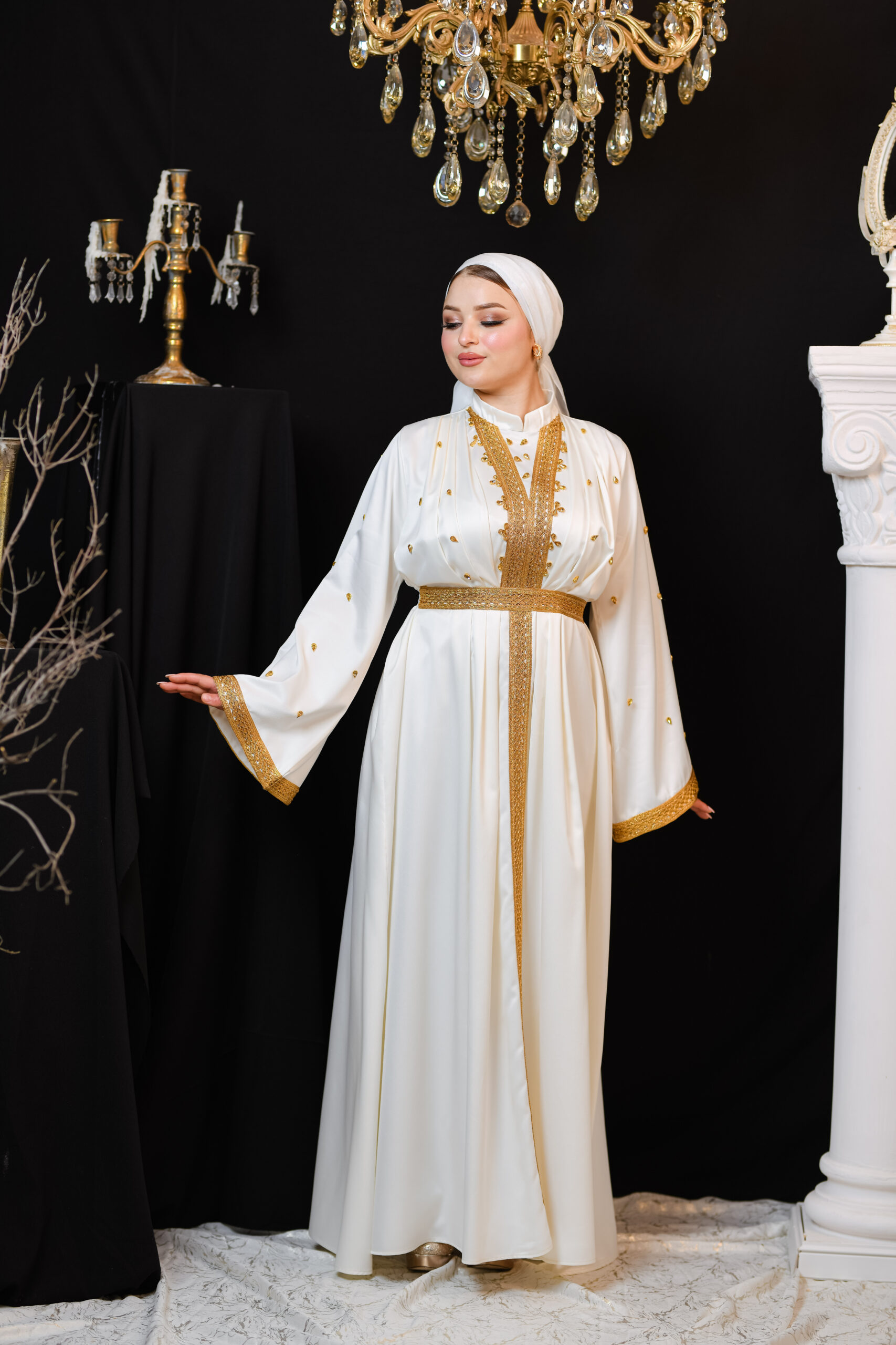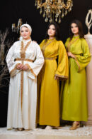 Thouraya est un kaftan qui reflète la splendeur authentique tunisienne. Son tissu léger et fluide, associé à ses broderies traditionnelles, lui confère un éclat particulier, révélant l’élégance et la dignité de celle qui le porte.