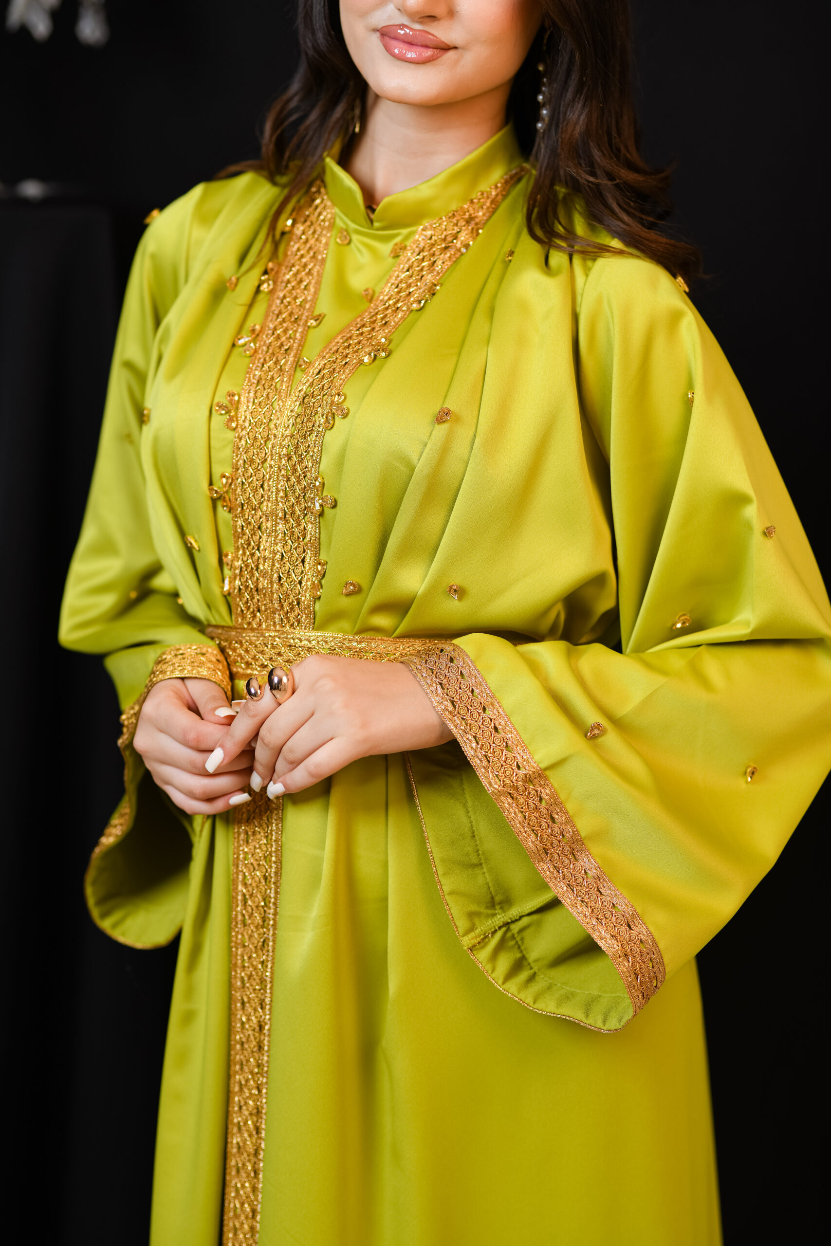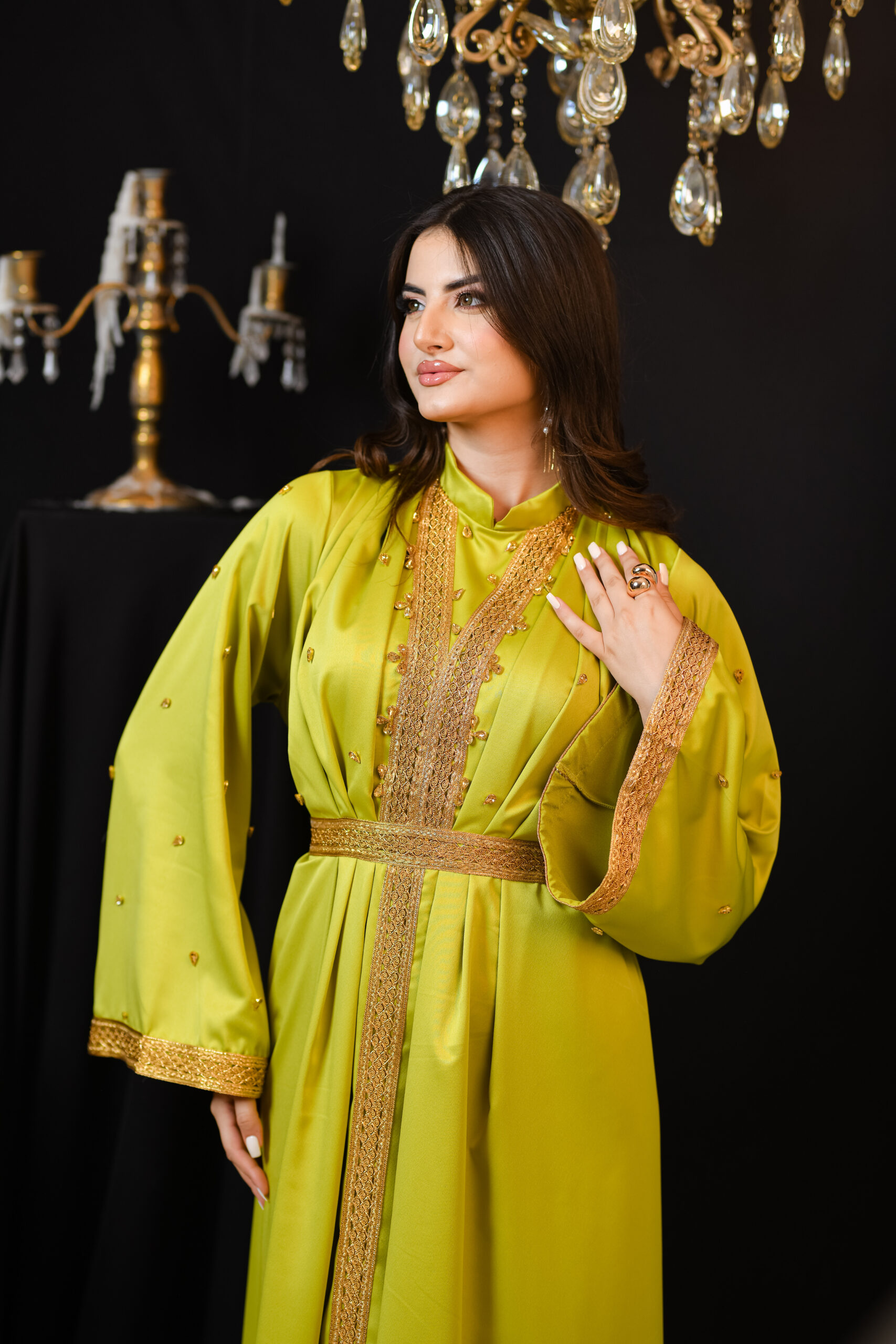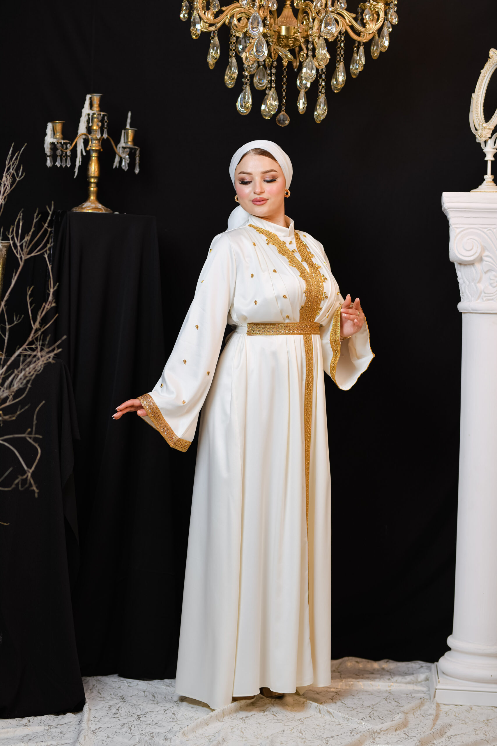 Thouraya est un kaftan qui reflète la splendeur authentique tunisienne. Son tissu léger et fluide, associé à ses broderies traditionnelles, lui confère un éclat particulier, révélant l’élégance et la dignité de celle qui le porte.